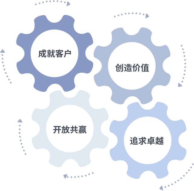 成就客户是一切决策的出发点,,,创造价值是衡量所有工作的标准,,,,追求卓越是我们做事做人的态度,,,开放共赢是我们的格局也是最终的结果。。。。价值观的齿轮环环相扣,,推动着组织里的每个人不断向前。。
